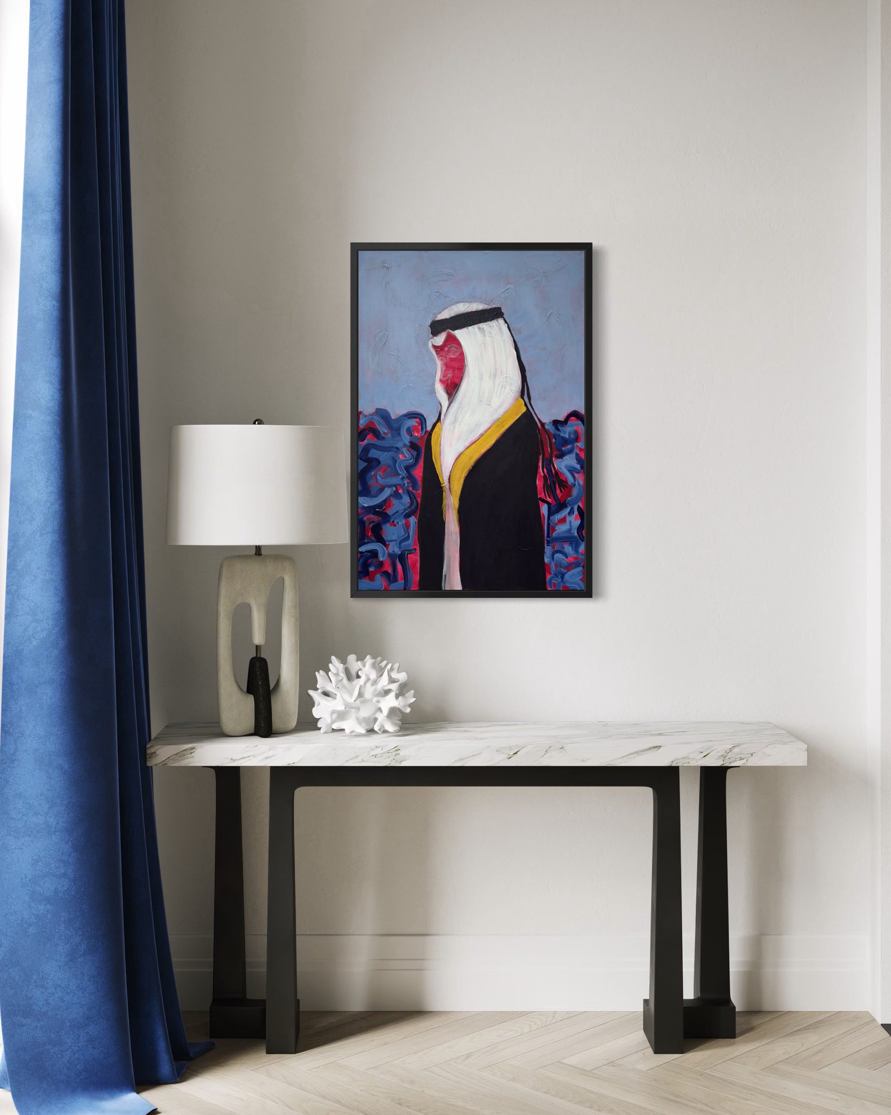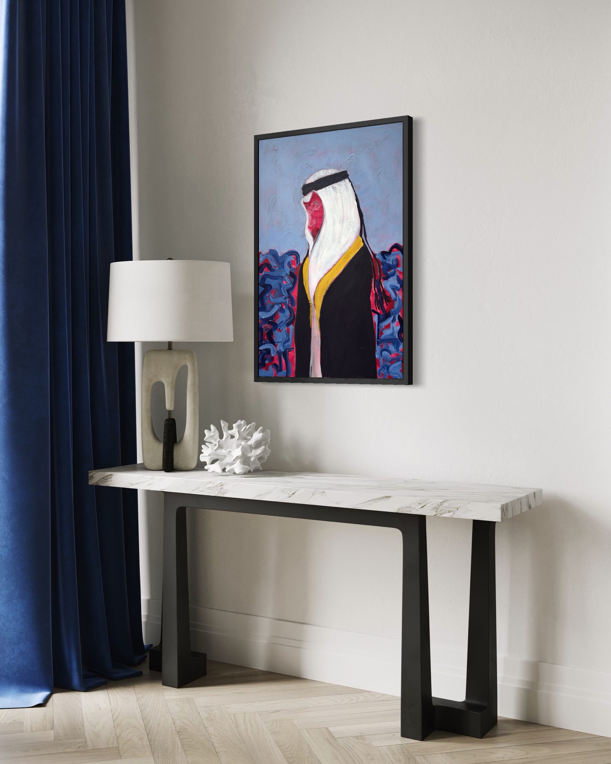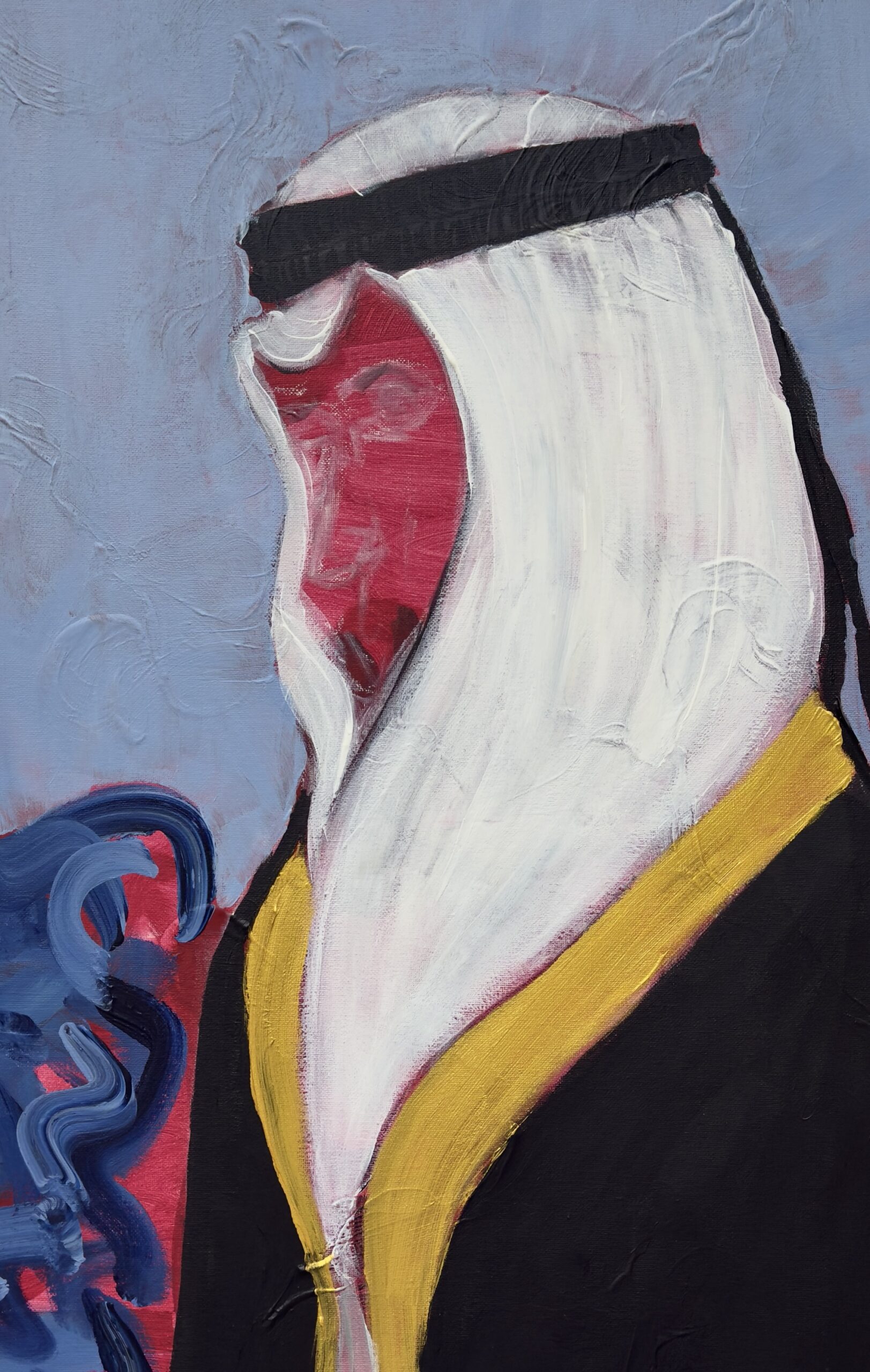 This artwork portrays a Qatari man wearing the bisht—an emblem of dignity, presence, and high standing. He moves steadily through surrounding noise, expressed in the background like restless ocean waves, while the textured sky suggests the motion of air and shifting rhythms.